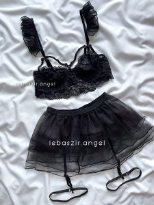 شامل سوتین هارنسی فنردار، دامن توری، بند جوراب، دو عدد گارتر دور ران و شورت لامبادا