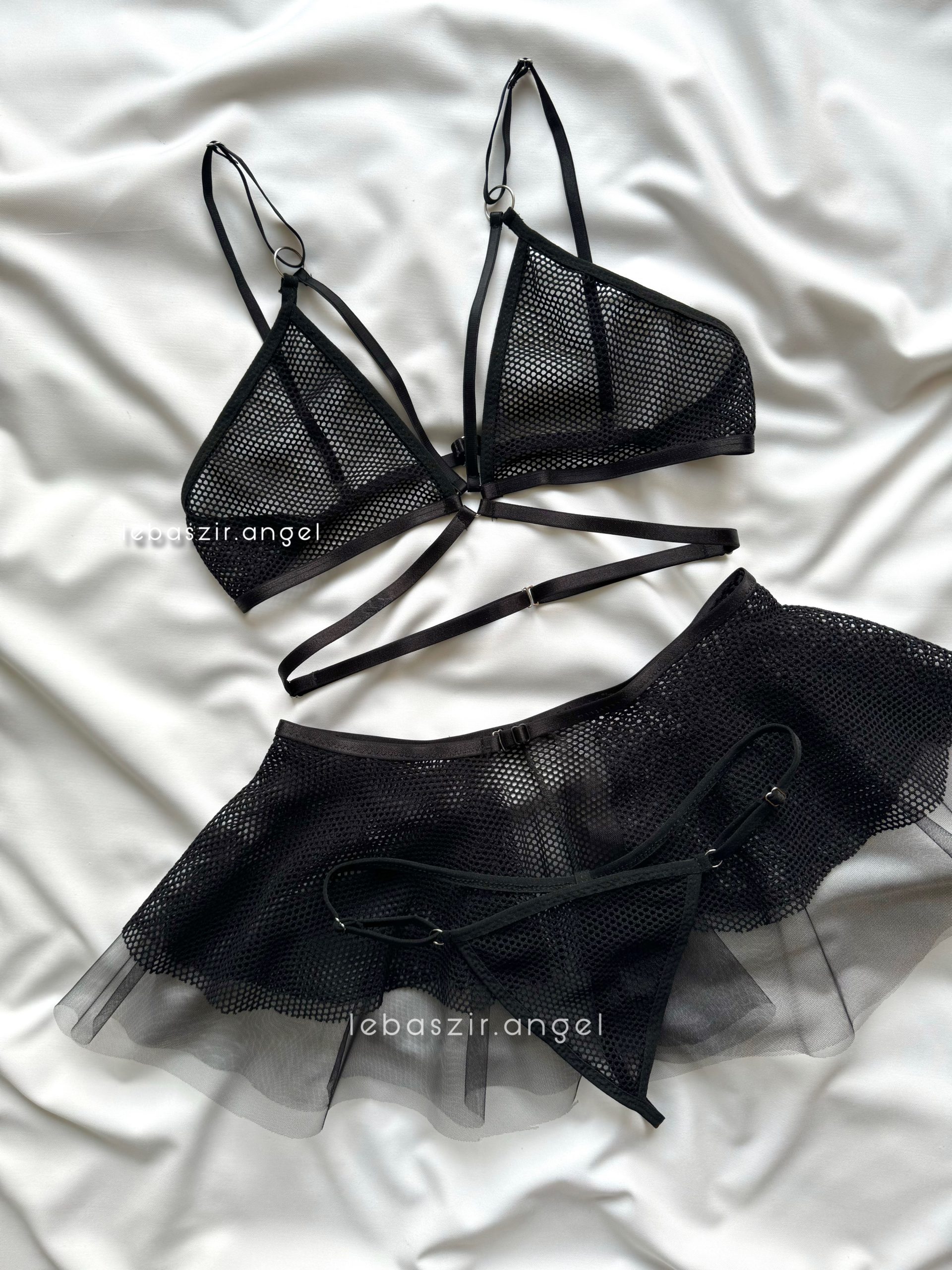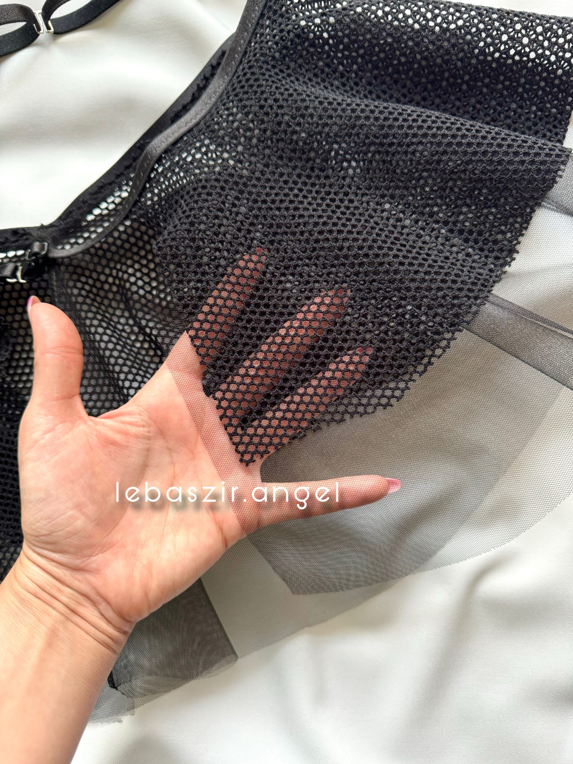 شامل سوتین فنردار زنجیری، شورت لامبادا، گارتر کمر با بند جوراب یا گارتر، دو عدد گارتر دور ران
