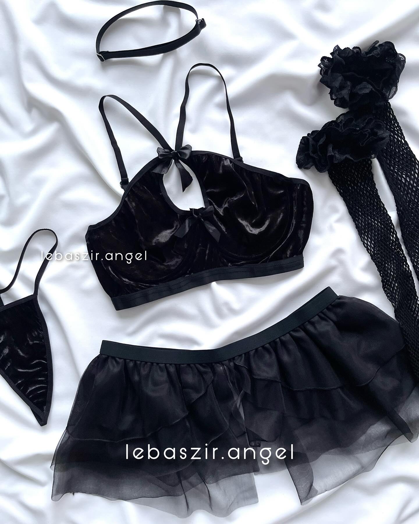 شامل نیمتنه و شورت مخمل، دامن توری، دو عدد بازوبند و جوراب فیشنت