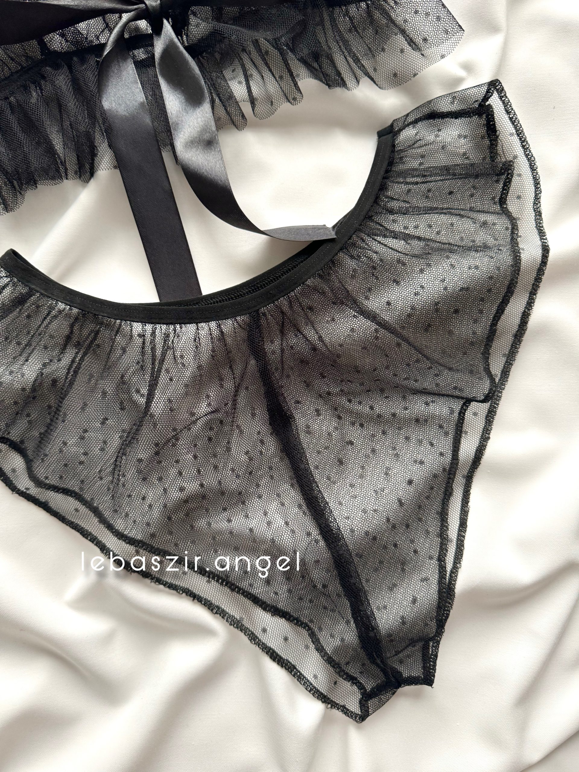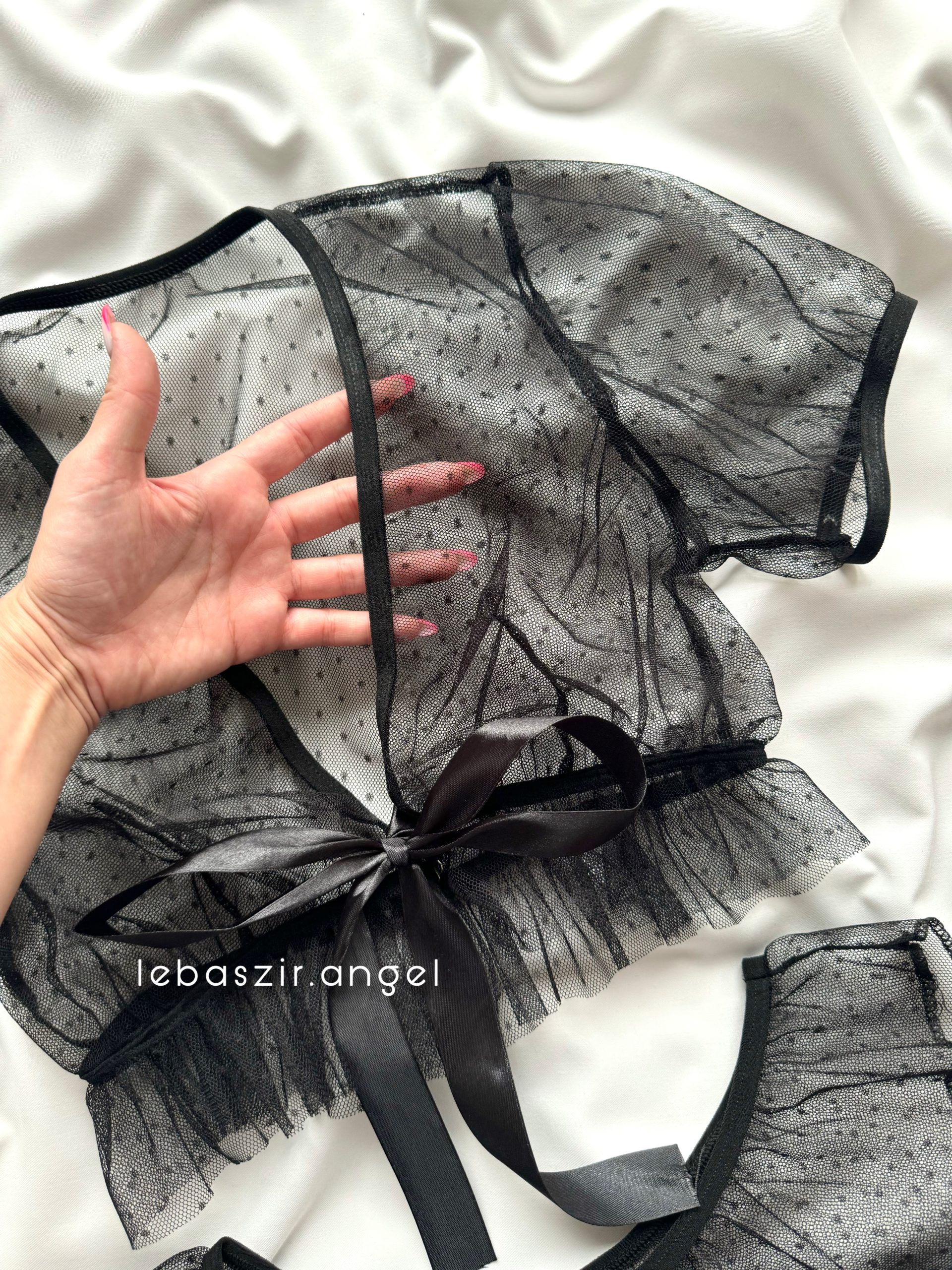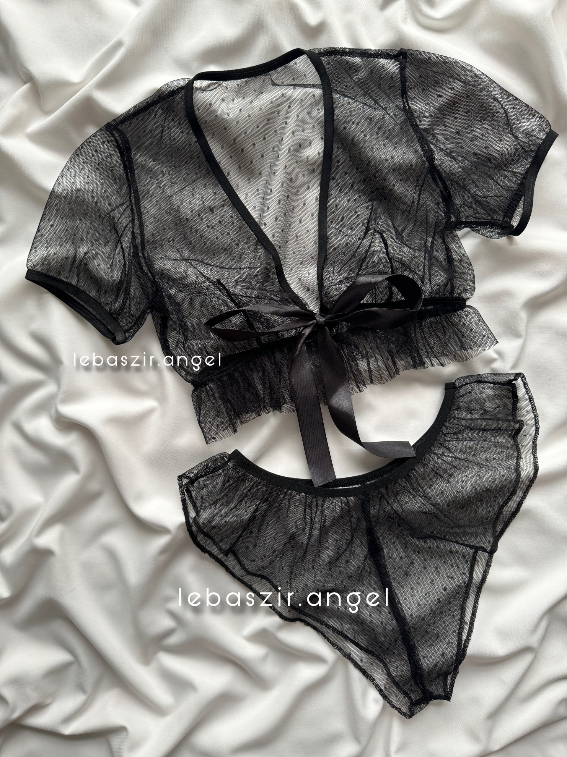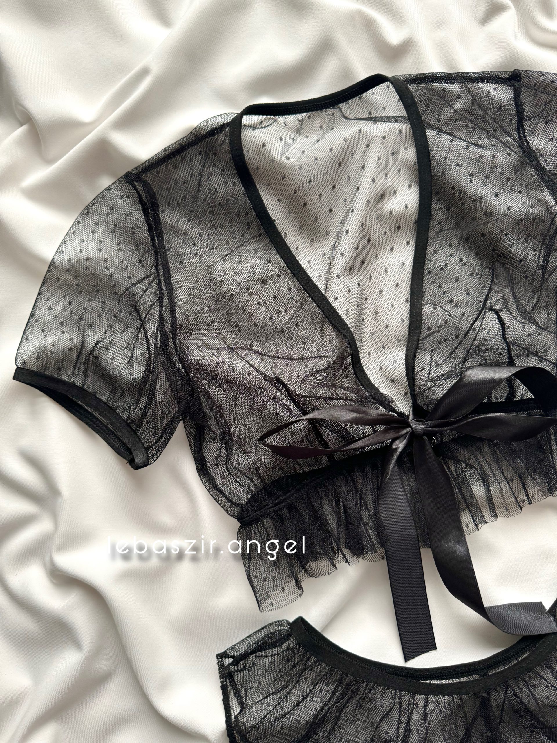 ست نیمتنه و شورت توری خالدار مشکی کد 1015