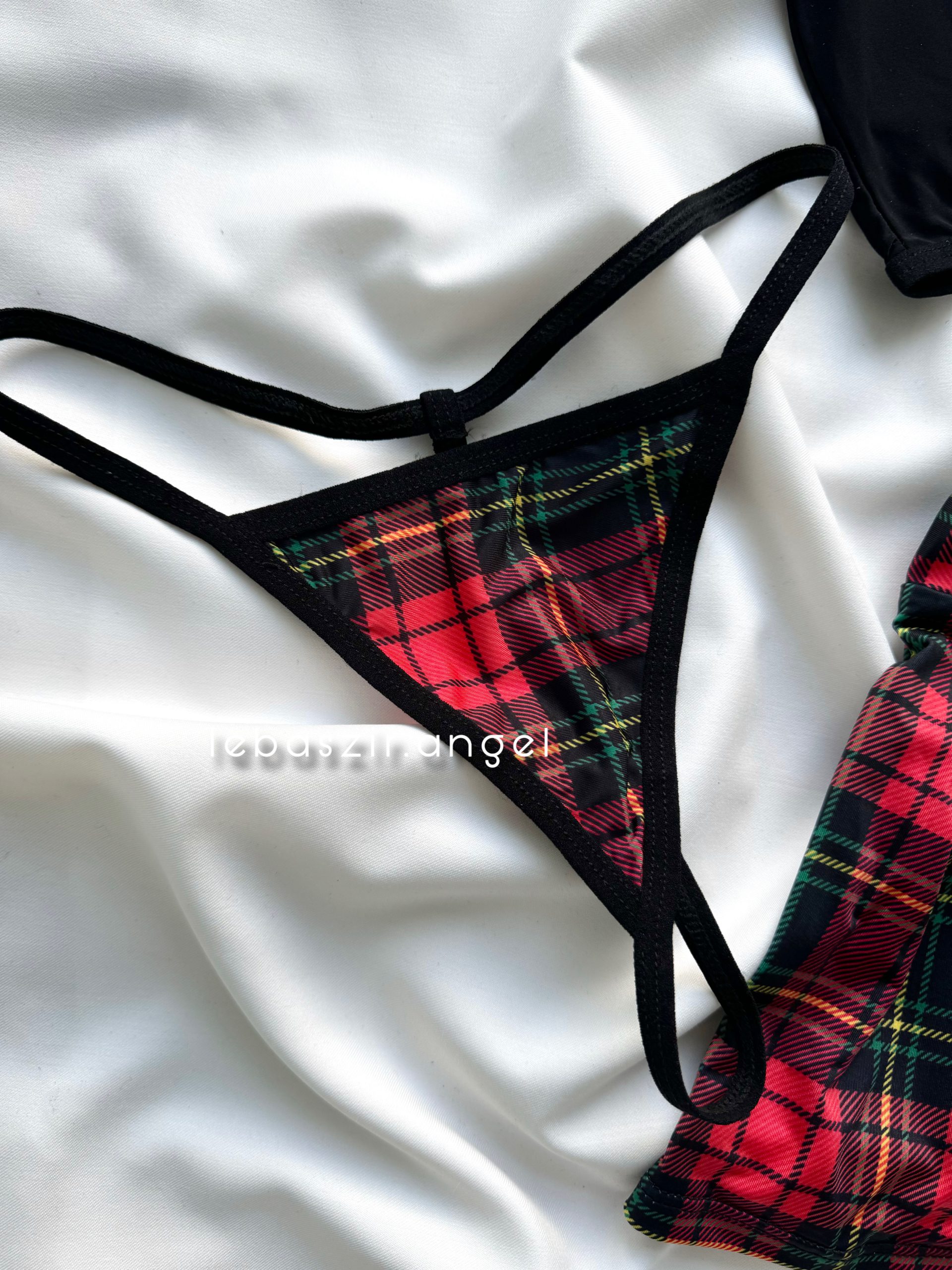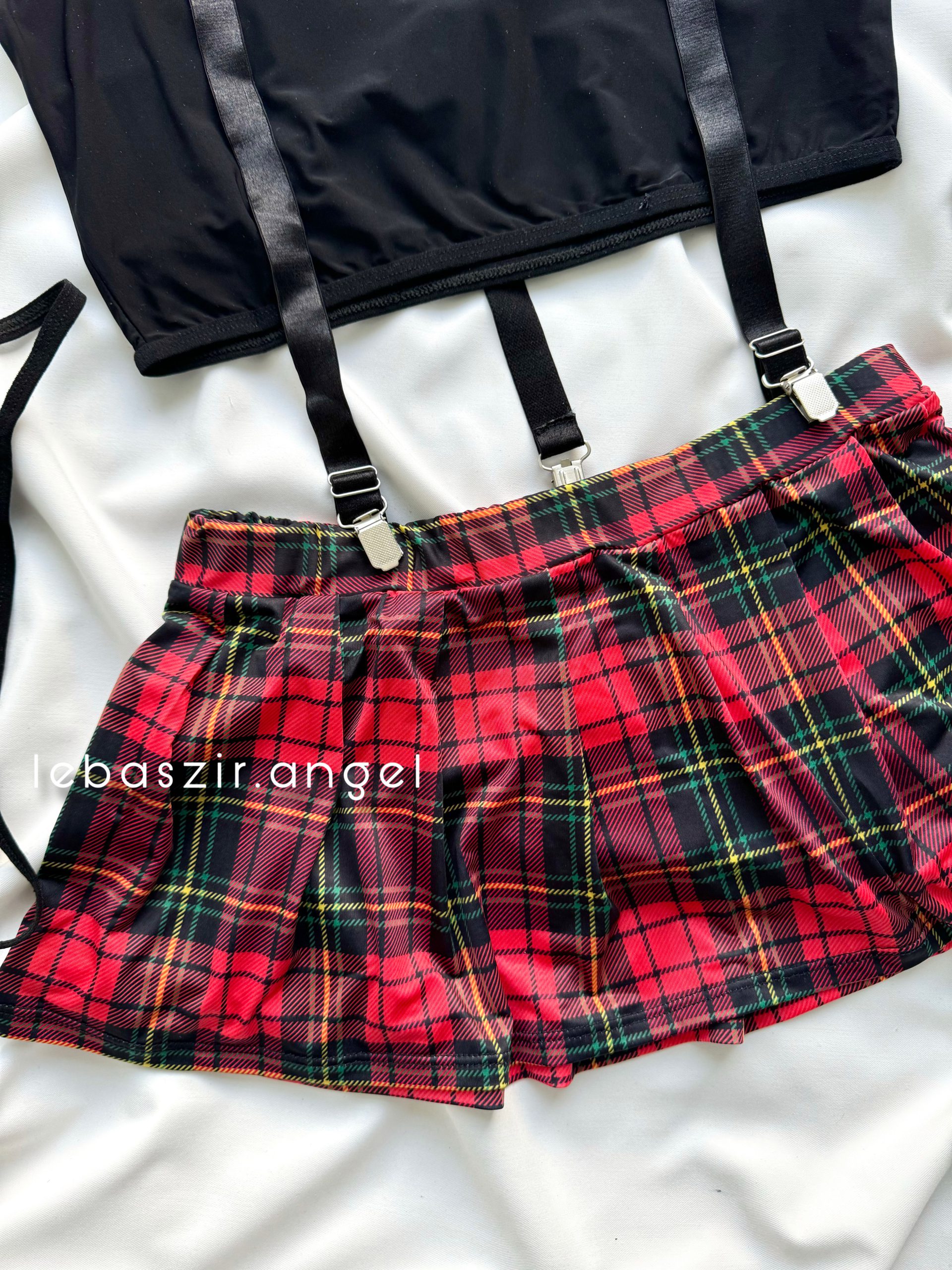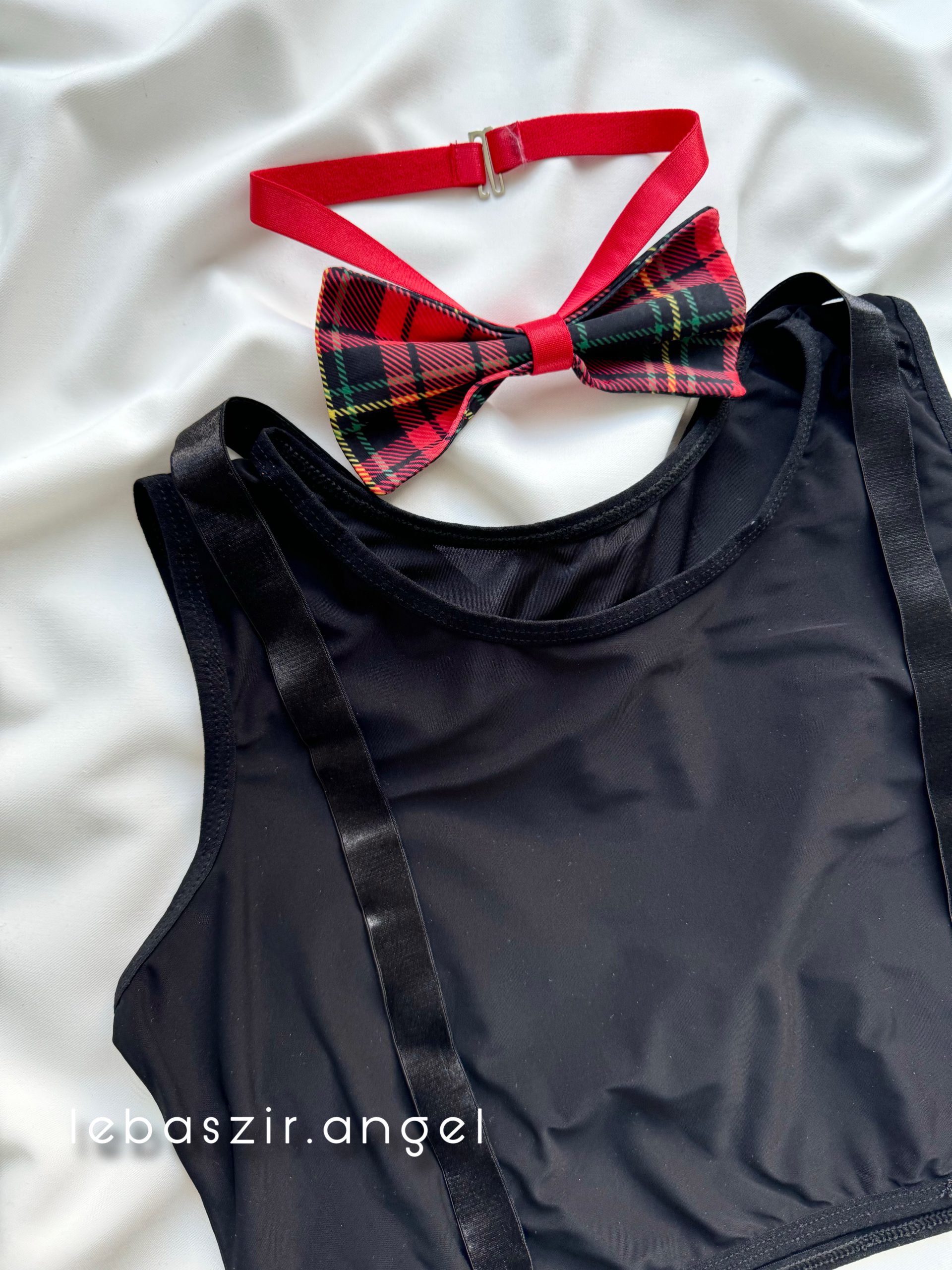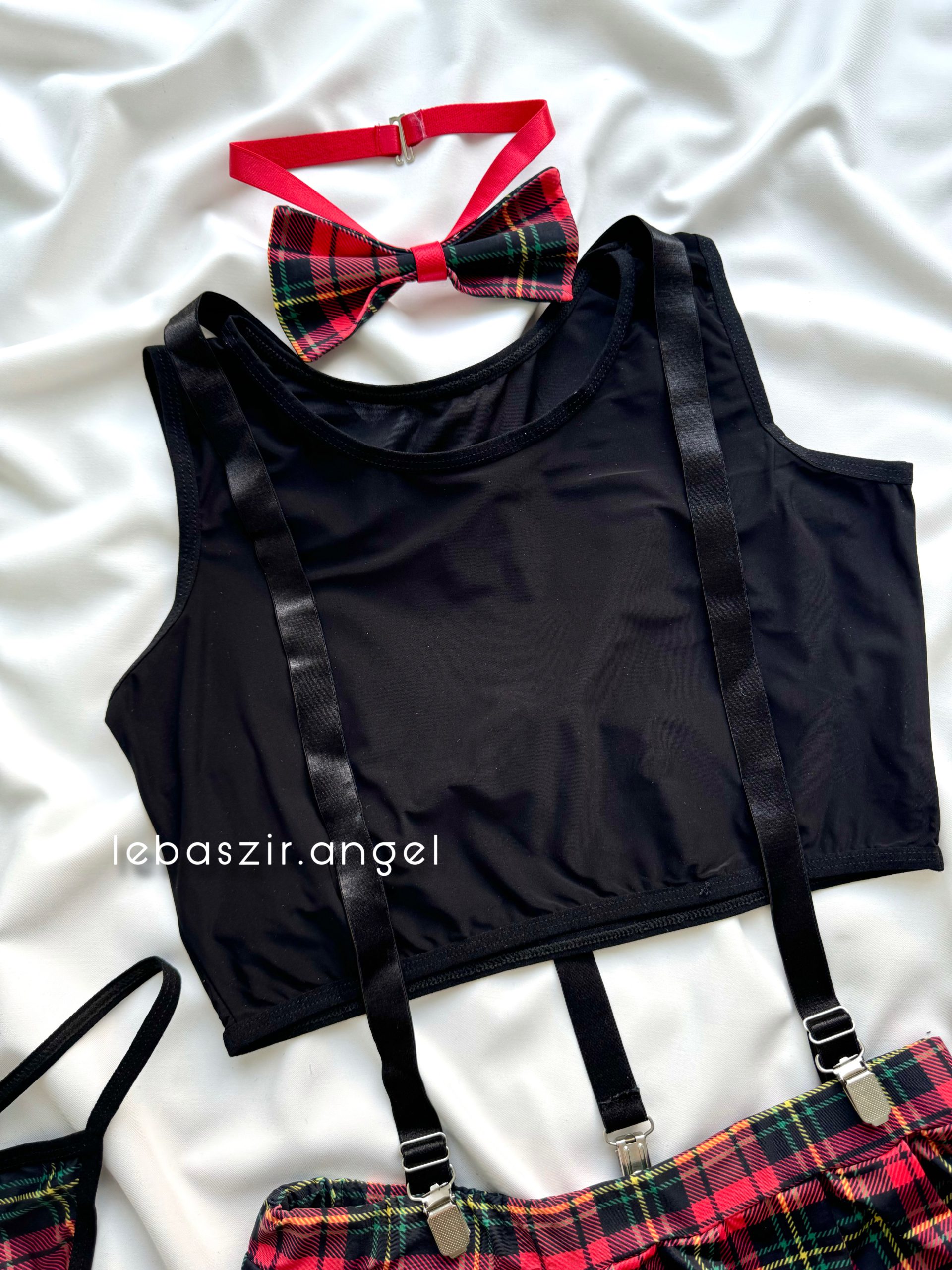 ست کامل شامل نیمتنه، دامن، ساسبند، شورت لامبادا و پاپیون گردنی