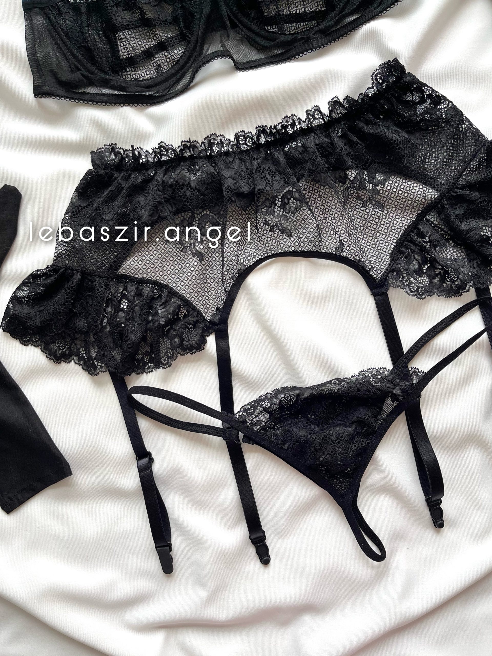 ست کامل شامل سوتین فنردار، شورت لامبادا، دستکش ها، بند جوراب و جوراب