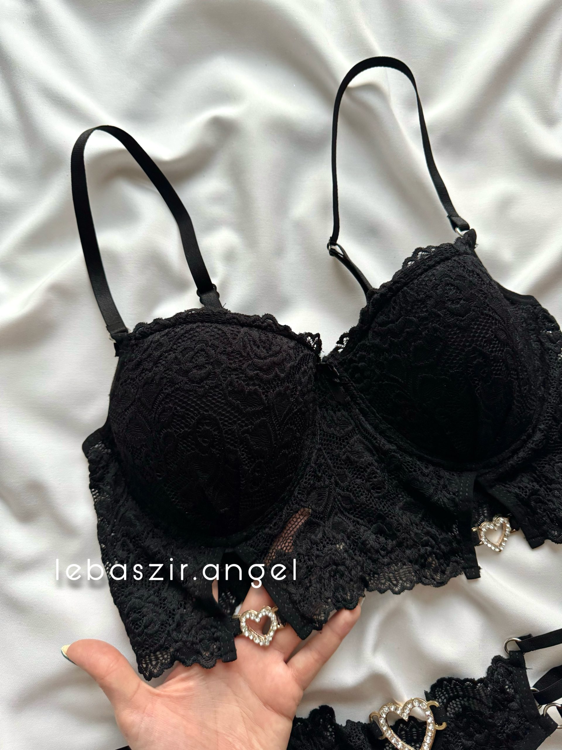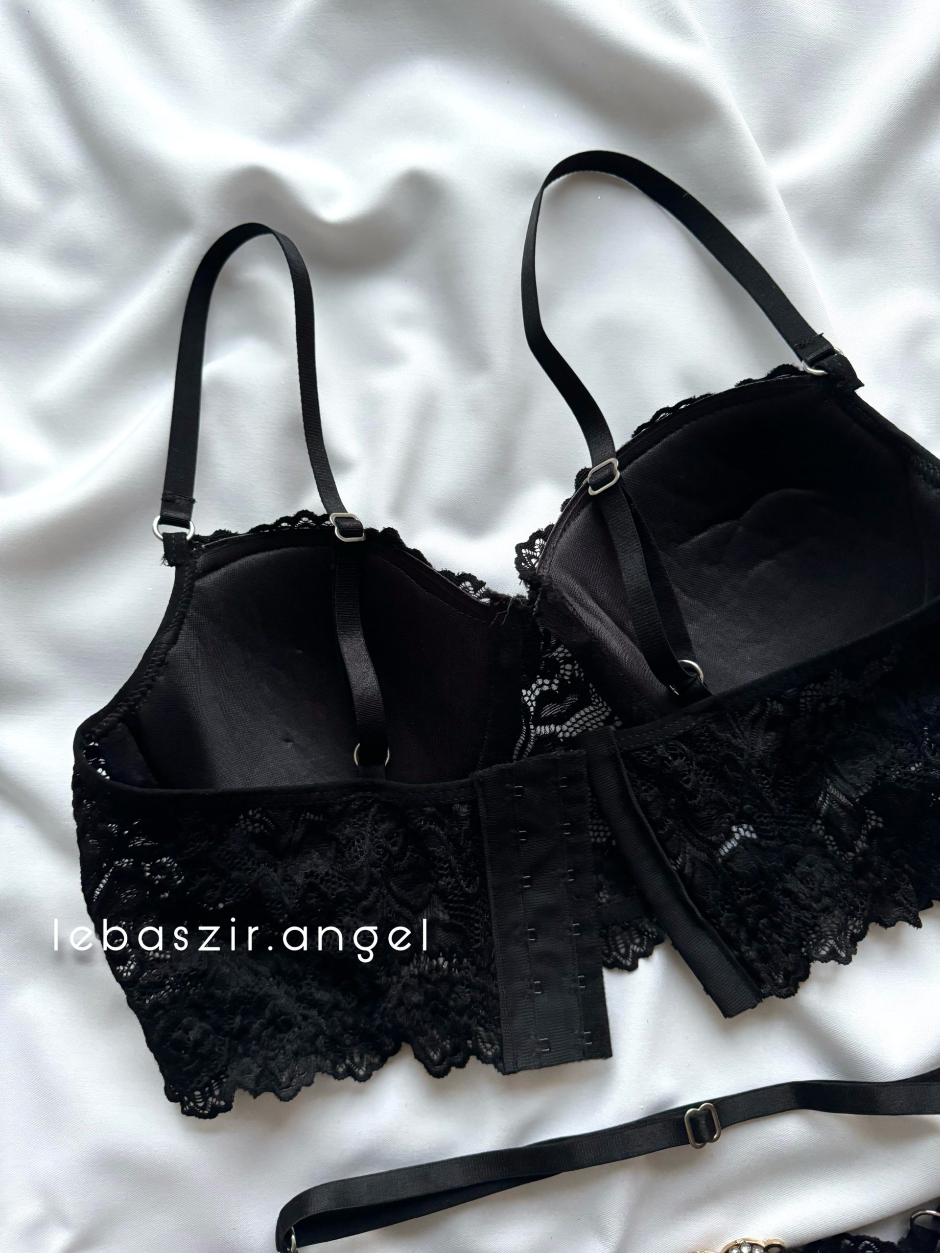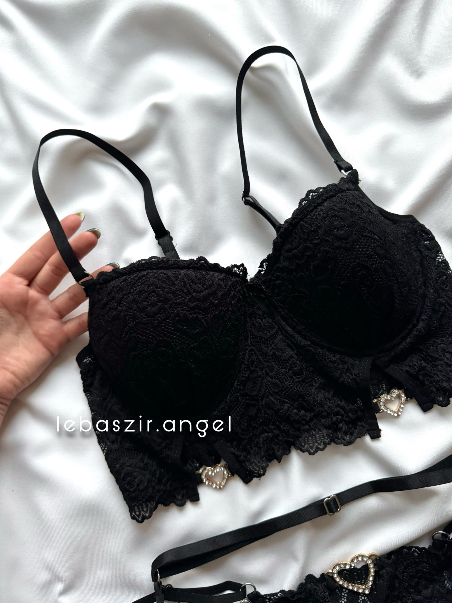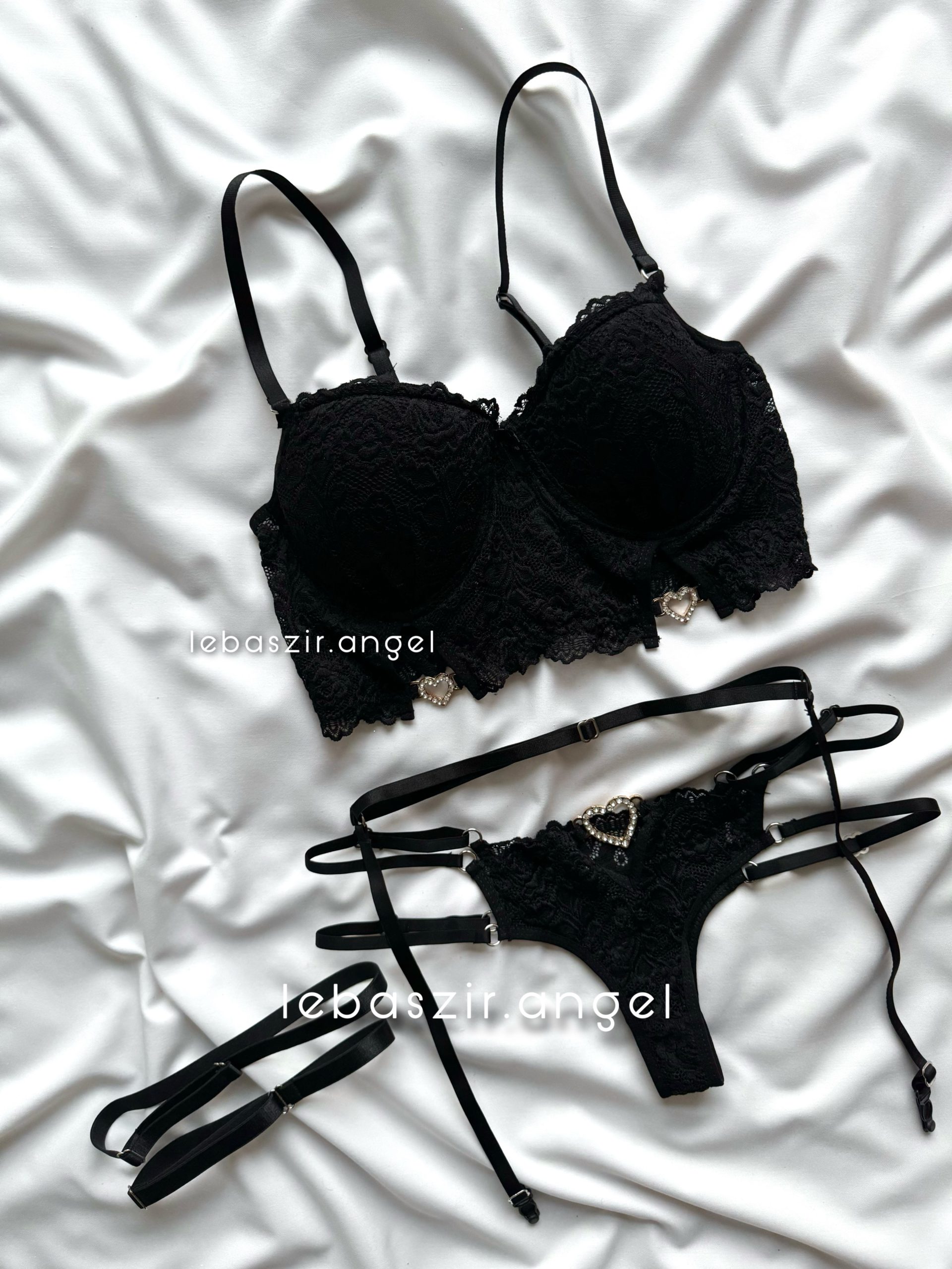 شامل سوتین اسفنجی فنردار، شورت بکلس قلبی، بند جوراب و دو عدد گارتر دور ران