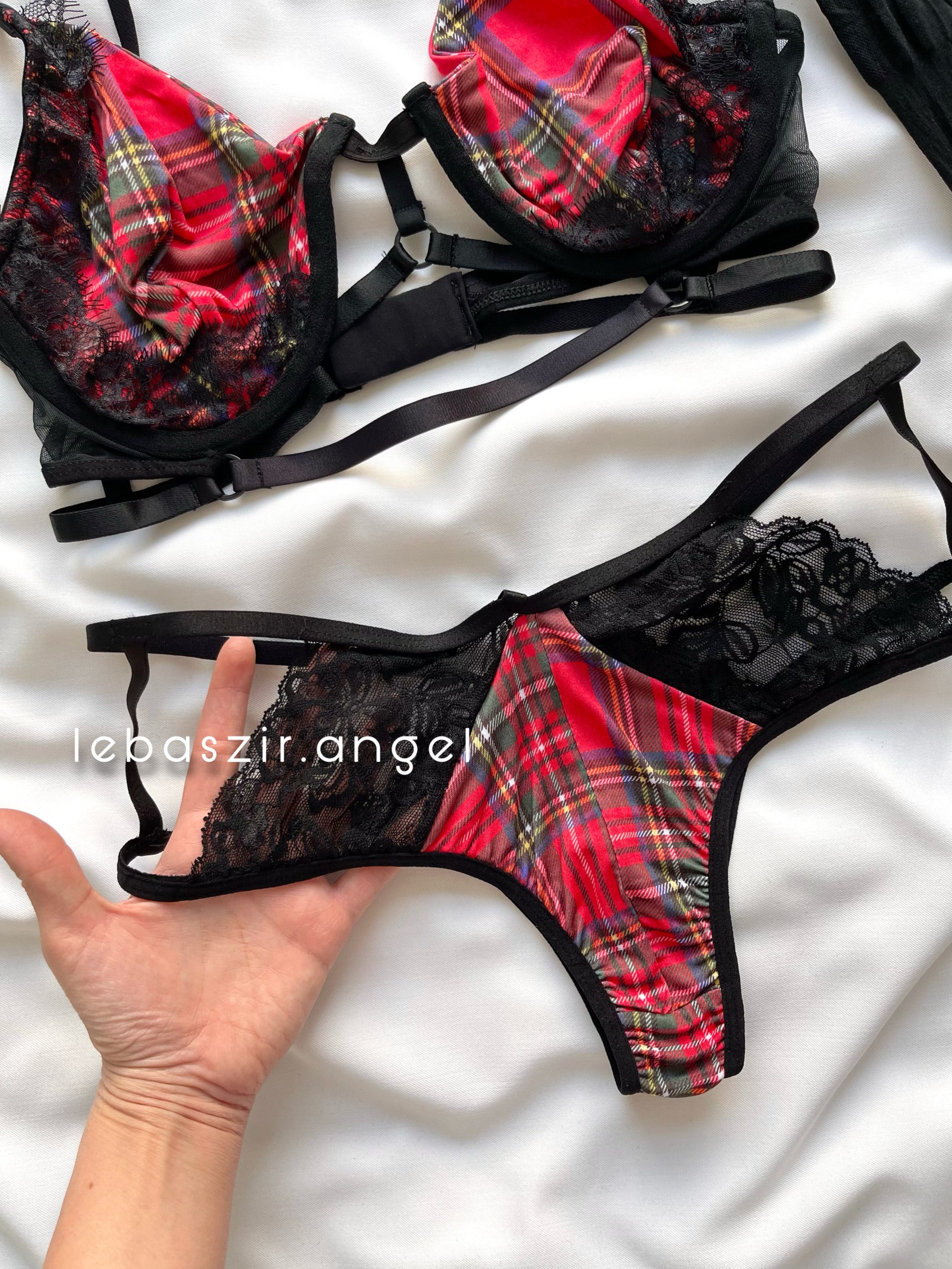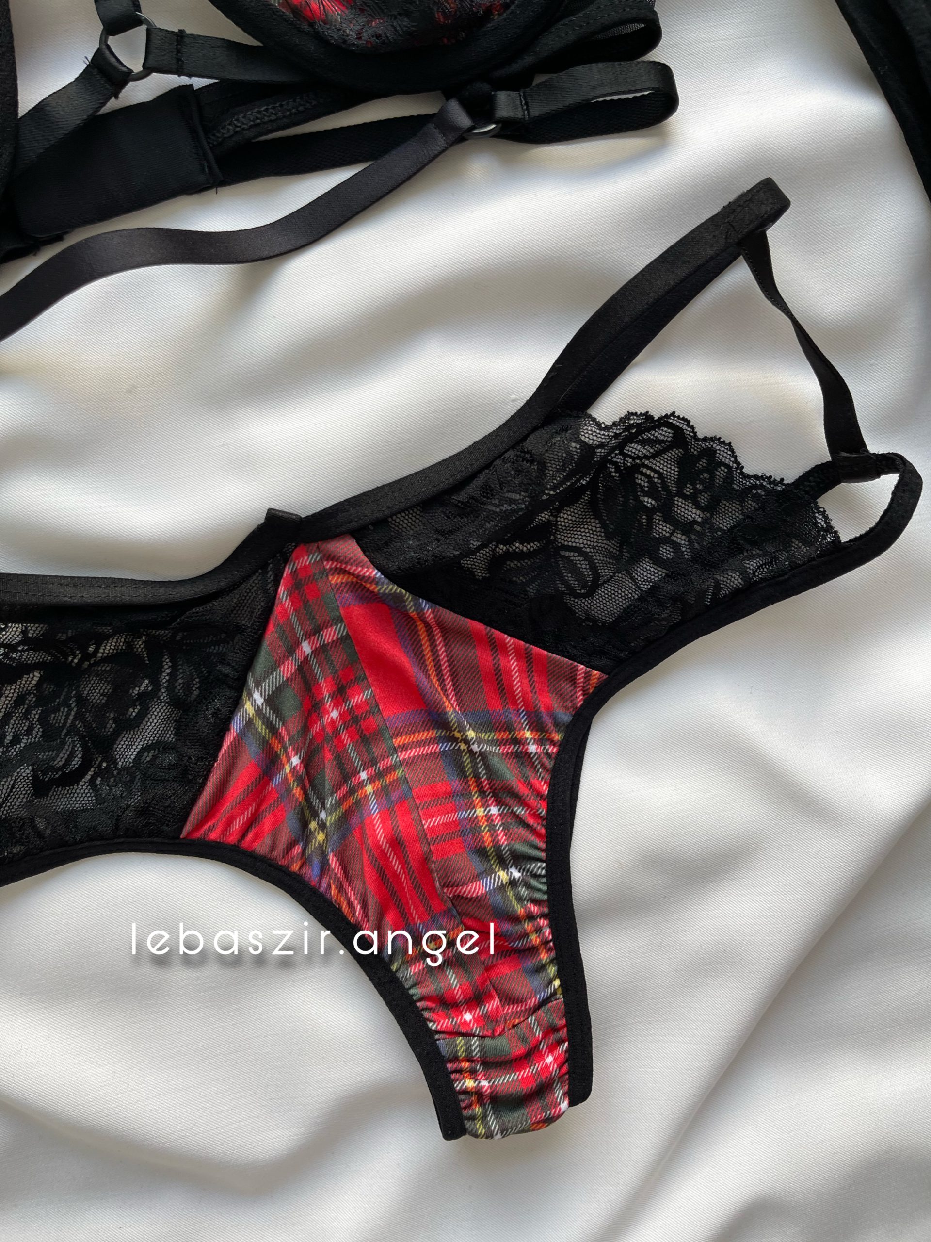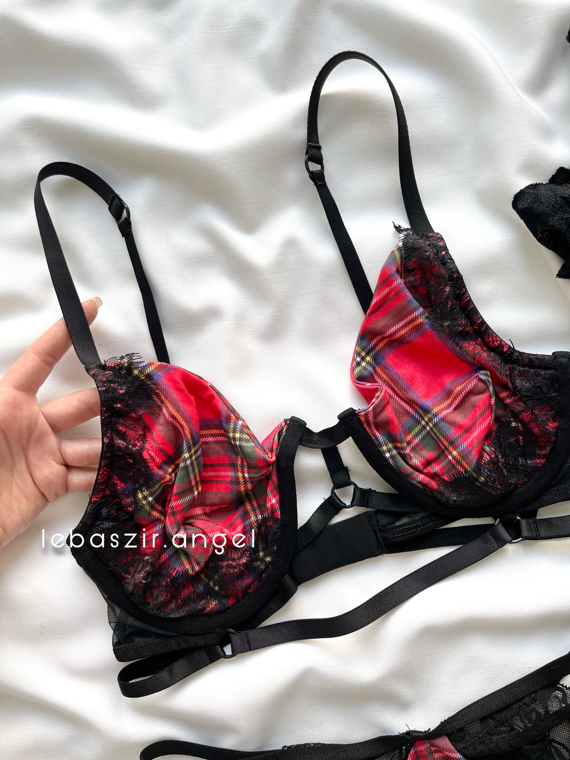 شامل سوتین هارنسی، شورت فاق باز، گارتر دور ران و کمر، گردنی و مچبندها